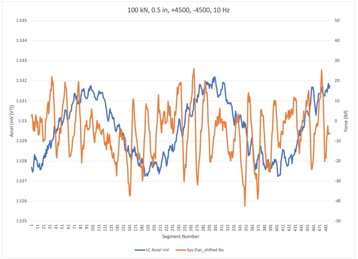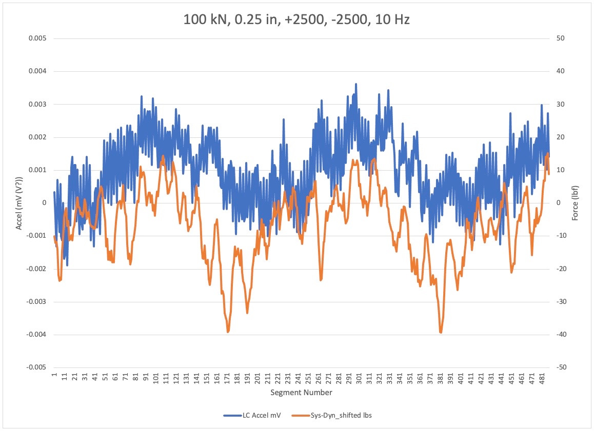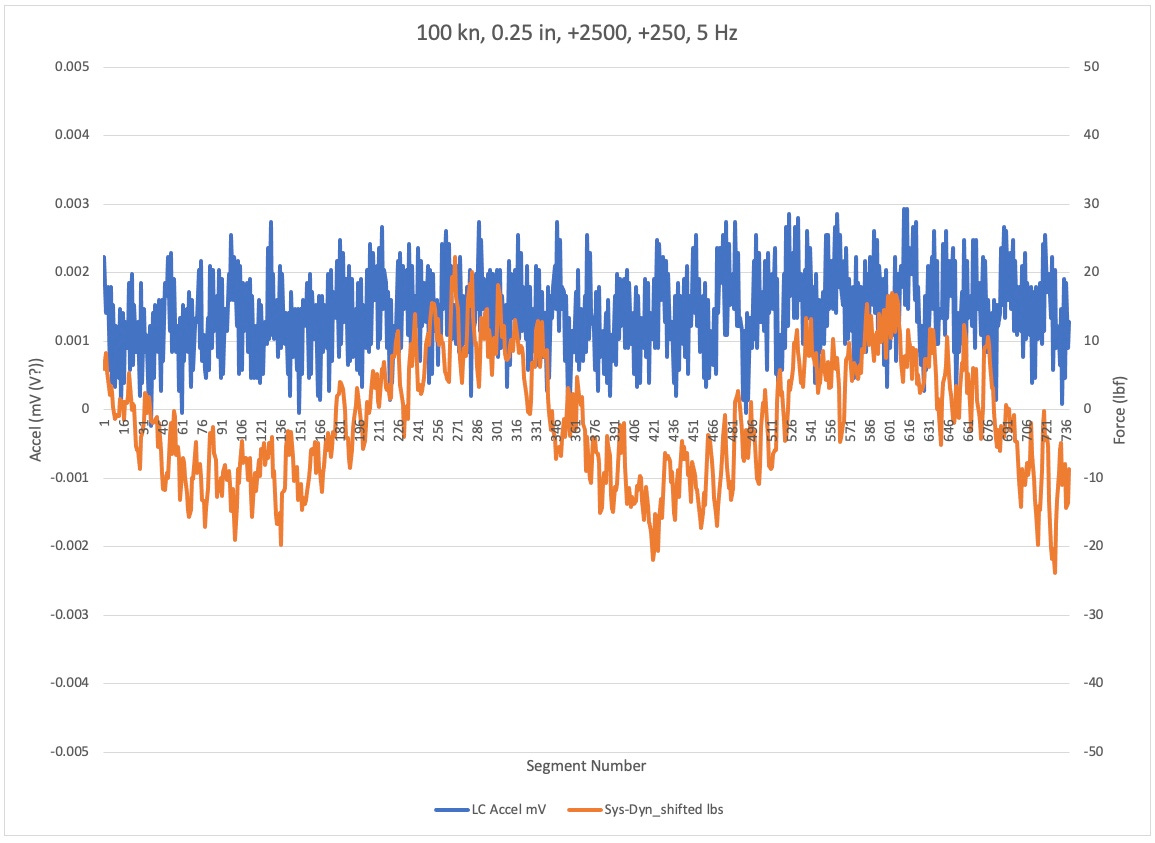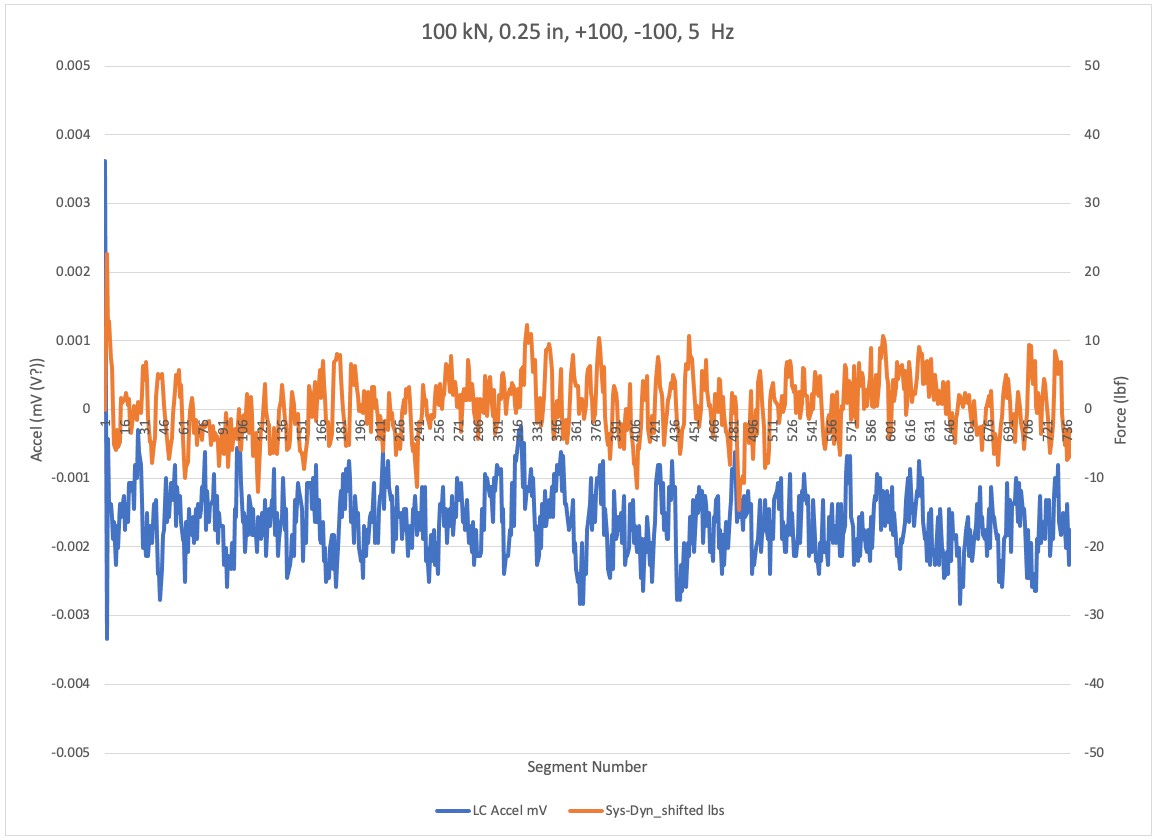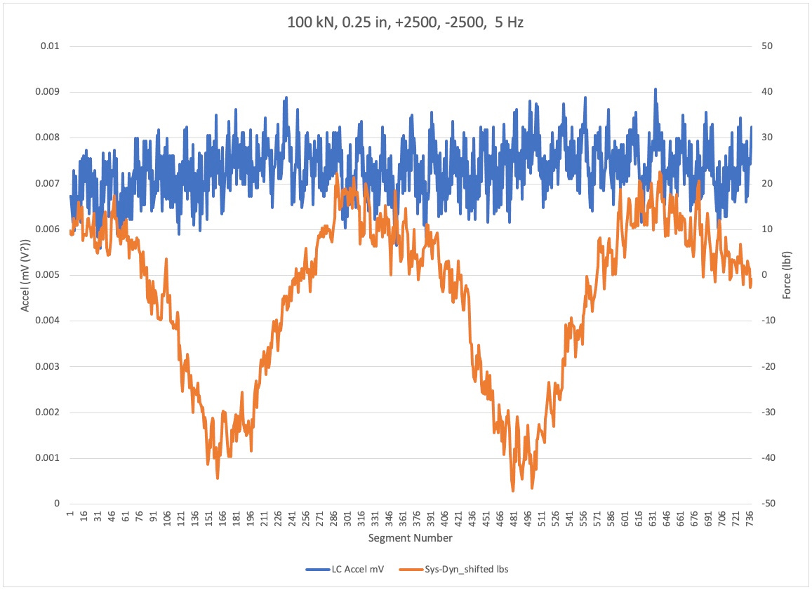I performed the E467 calculations on the +/- 2500 lb, 100 kN frame, 0.25 in diameter bar at 5 Hz. With the peaks and valleys identified for both the load cell and dynamometer, the largest valley error is 6.77 lbf and the maximum peak error is 7.28 lbf. I understand that when you look at the entire plot of error there are expected acquisition errors away from the peak and valley, but I don't see that a 0.135% and a 0.146% maximum valley and peak error shows bad correlation between the data. I am looking for my baseline noise on the accelerometer file, but can't find it. I also realize that I noted all of the accelerometer units wrong. They are in Volts not mV.