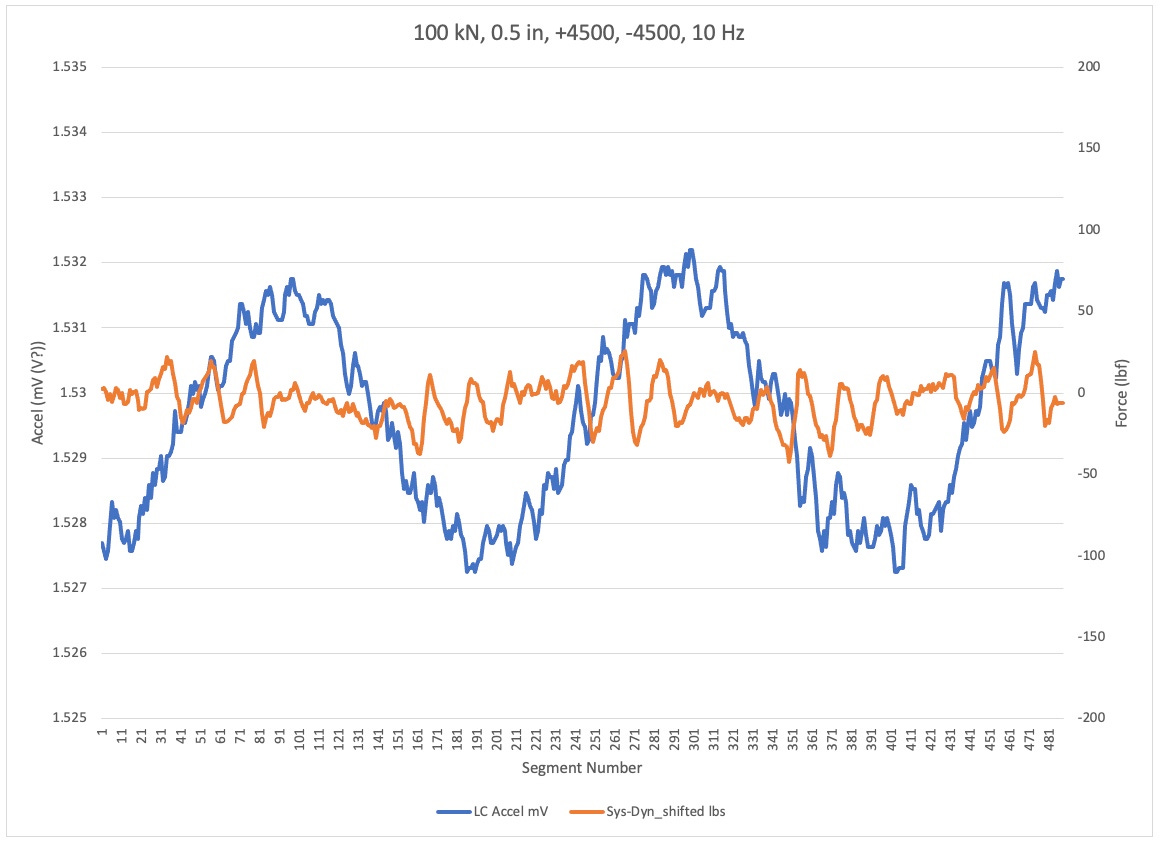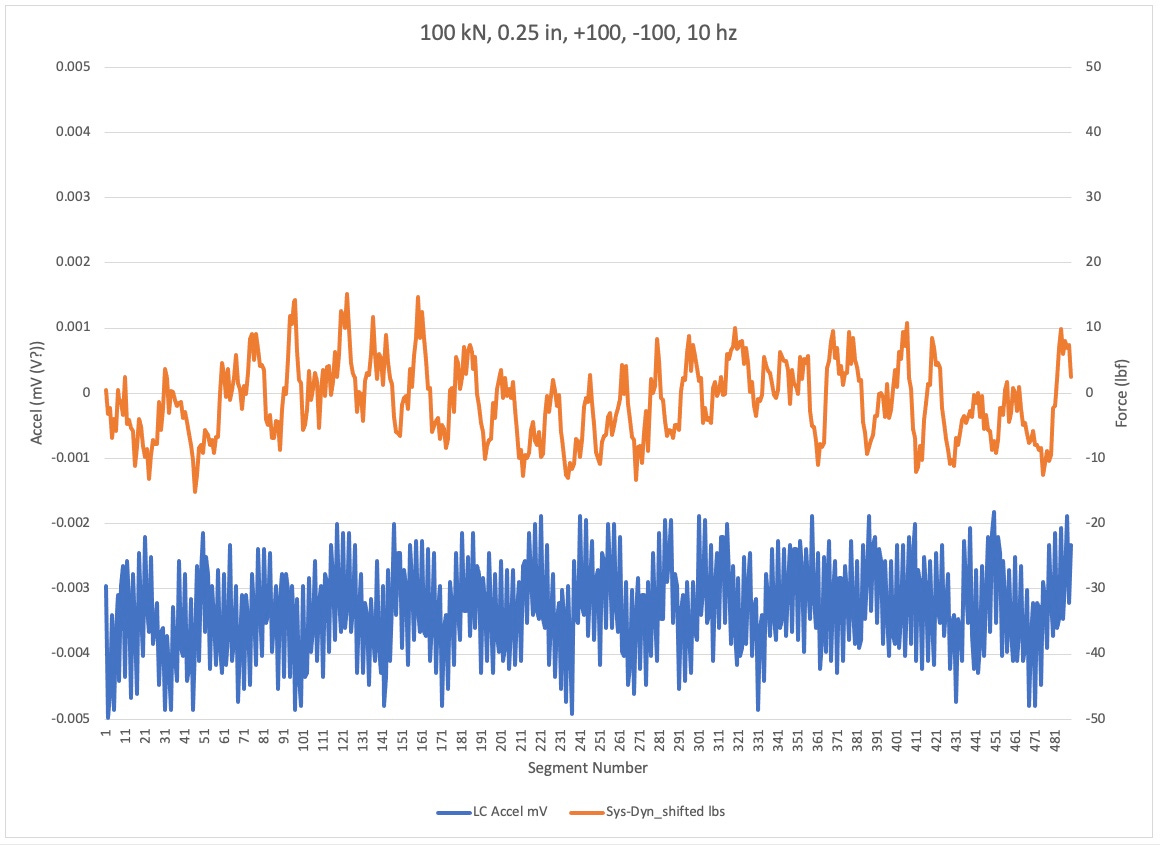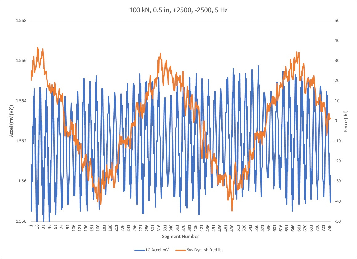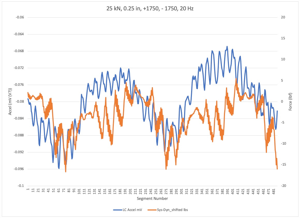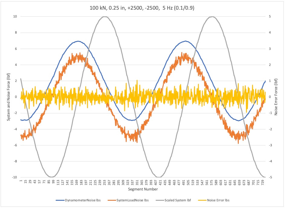 I performed the E467 calculations on the +/- 2500 lb, 100 kN frame, 0.25 in diameter bar at 5 Hz. With the peaks and valleys identified for both the load cell and dynamometer, the largest valley error is 6.77 lbf and the maximum peak error is 7.28 lbf. I understand that when you look at the entire plot of error there are expected acquisition errors away from the peak and valley, but I don't see that a 0.135% and a 0.146% maximum valley and peak error shows bad correlation between the data. I am looking for my baseline noise on the accelerometer file, but can't find it. I also realize that I noted all of the accelerometer units wrong. They are in Volts not mV.