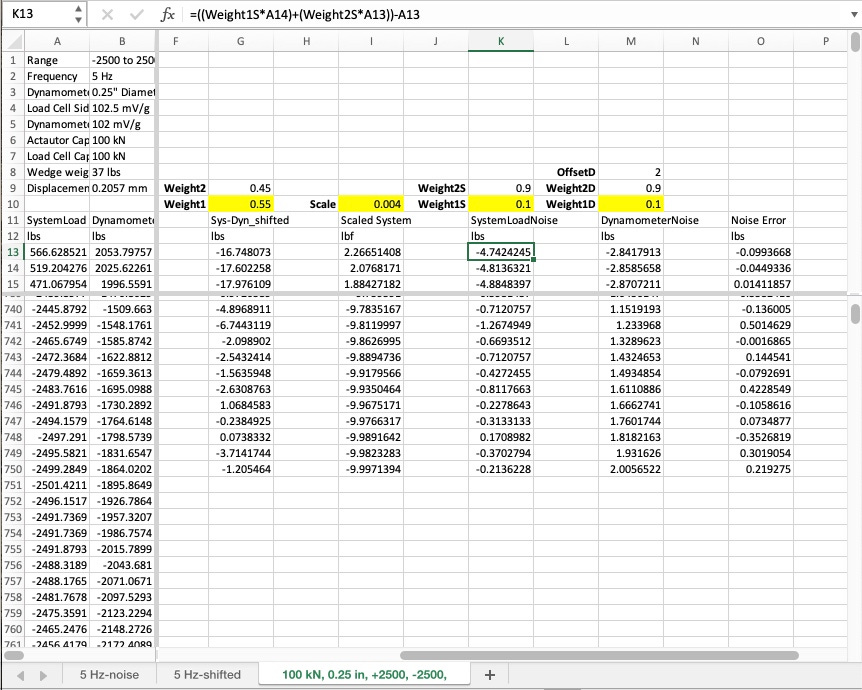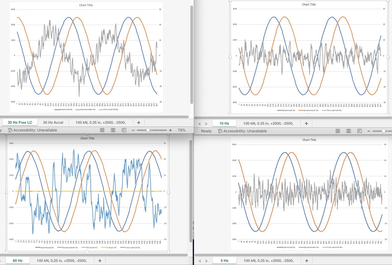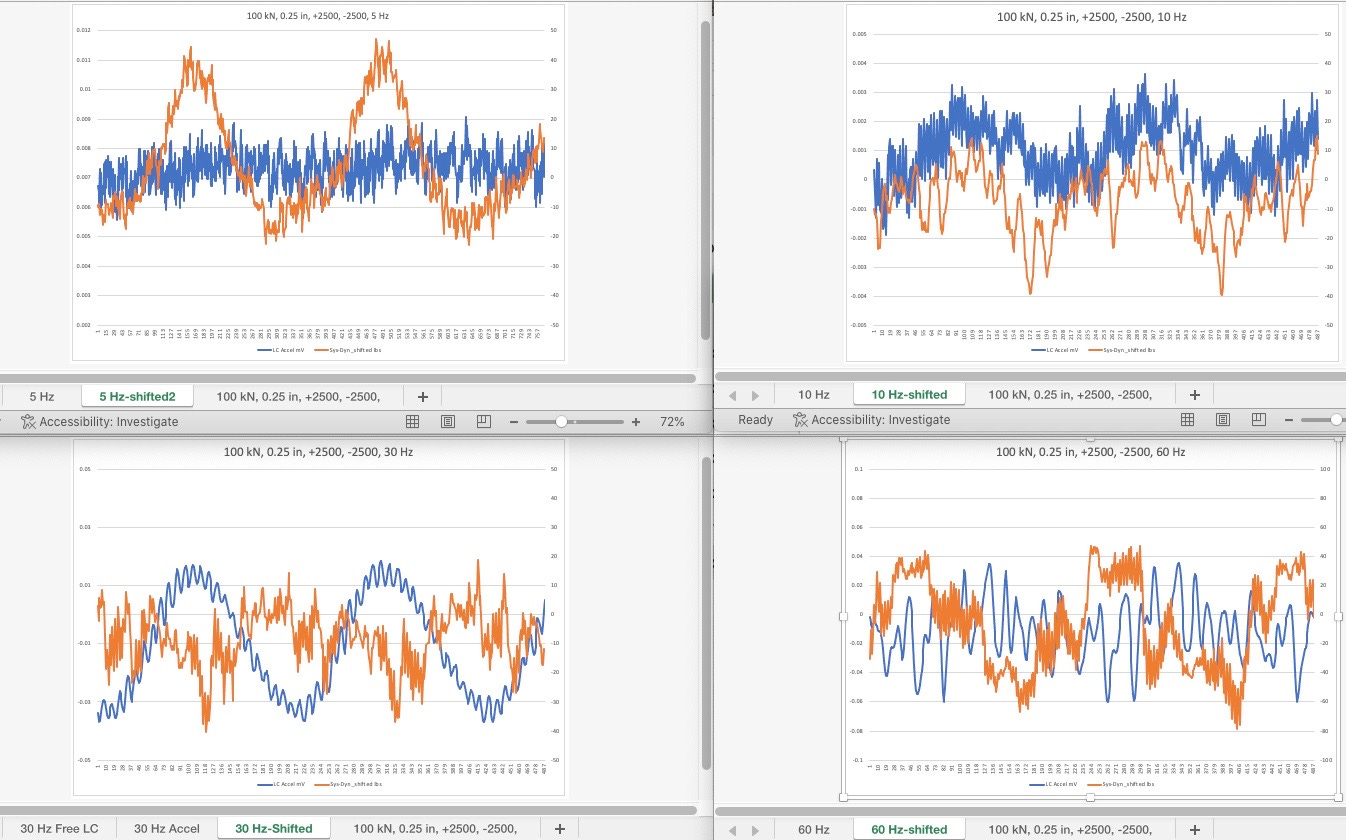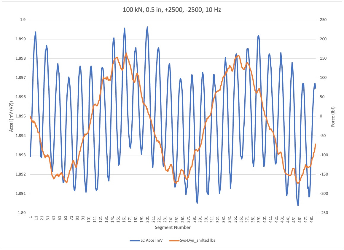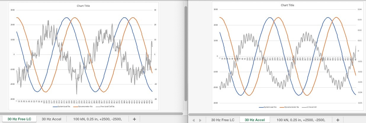 I performed the E467 calculations on the +/- 2500 lb, 100 kN frame, 0.25 in diameter bar at 5 Hz. With the peaks and valleys identified for both the load cell and dynamometer, the largest valley error is 6.77 lbf and the maximum peak error is 7.28 lbf. I understand that when you look at the entire plot of error there are expected acquisition errors away from the peak and valley, but I don't see that a 0.135% and a 0.146% maximum valley and peak error shows bad correlation between the data. I am looking for my baseline noise on the accelerometer file, but can't find it. I also realize that I noted all of the accelerometer units wrong. They are in Volts not mV.